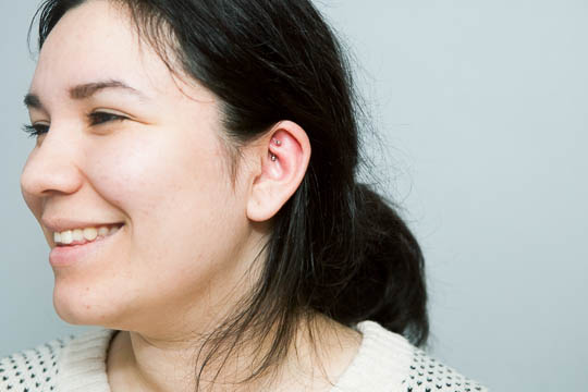 En lite ovanligare och mer avancerad öronpiercing. Ofta fungerar det bÀttre att sÀtta den lÀngre in, men dÄ syns den mndre. Det blir en kompromiss. Sen lÄngt frÄn alla som denna piercing lÀmpar sig pÄ.